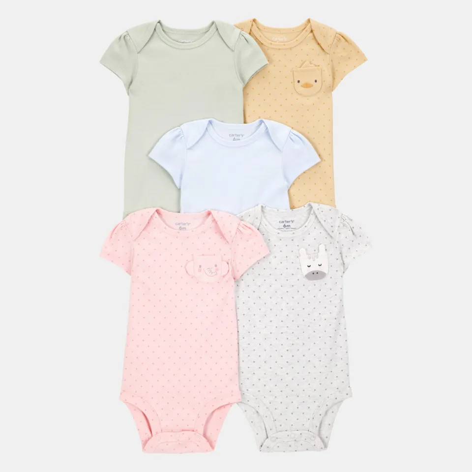 From morning snuggles to afternoon stroller rides, this 5-pack of bodysuits is prepped for all the moments in between. With prints featuring bunnies, tiny florals, and a charming train scene, getting dressed just got way more fun.