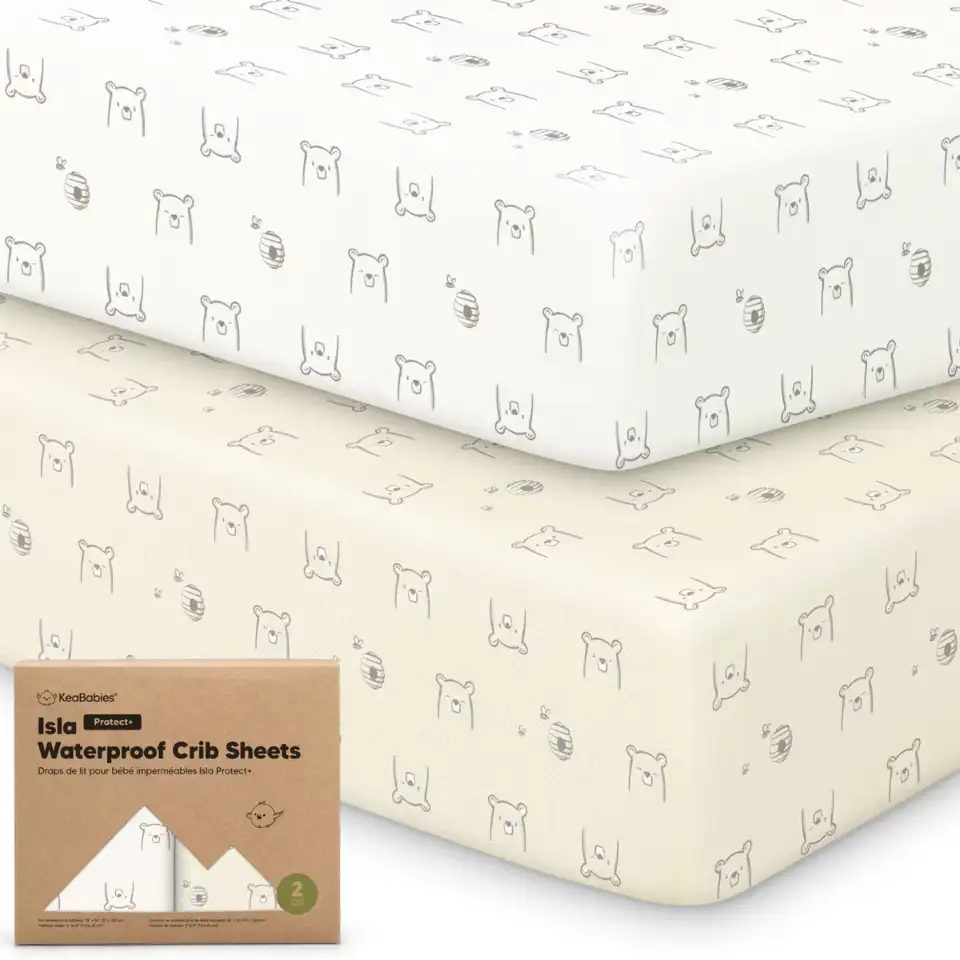 KeaBabies Isla Protect+ Waterproof Fitted Crib Sheets are must-have newborn essentials for new moms and dads. Designed for ultimate comfort and functionality, not only are these soft baby sheets breathable and regulates temperature, these waterproof-lined toddler bed sheets act as crib mattress protector guarding against leaks and stains. The SnugFit bands hold these waterproof sheets in place, providing a peaceful slumber.