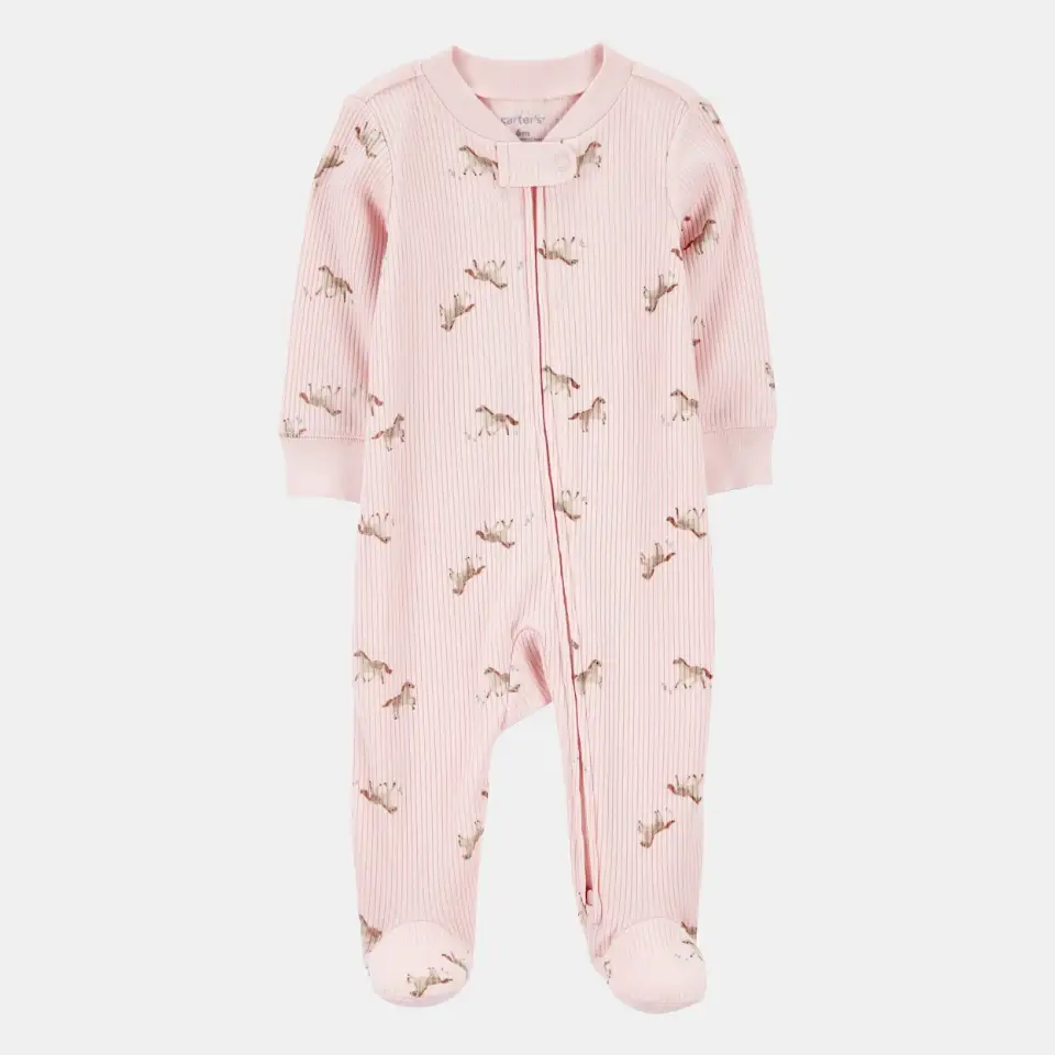 When sleepy snuggles turn into midnight diaper changes, this ribbed zip-up is your new best friend. The 2-way zip makes changes faster, and built-in footies mean no missing socks at 3 a.m. With soft and silky fabric and a sweet allover horse print, it's comfy enough for bedtime and cute enough for coffee runs.