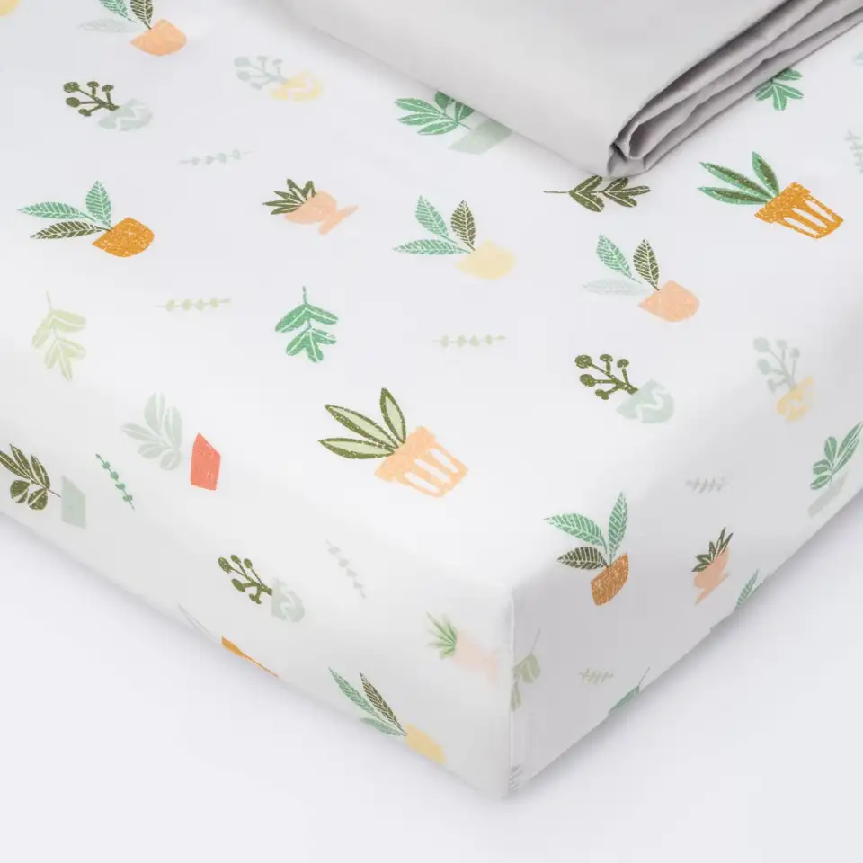 This 2-Pack of fitted crib sheets includes two fitted crib sheets to fit standard cribs and toddler beds. Made from 100% cotton, these standard crib sheets fit six-inch mattresses, and they're designed with an all-around elastic for securing over the corners of the mattress. The pack includes two fitted crib sheets—one in a solid gray hue and the other featuring allover potted plant prints on a white background—to bring sweet style to your nursery decor.