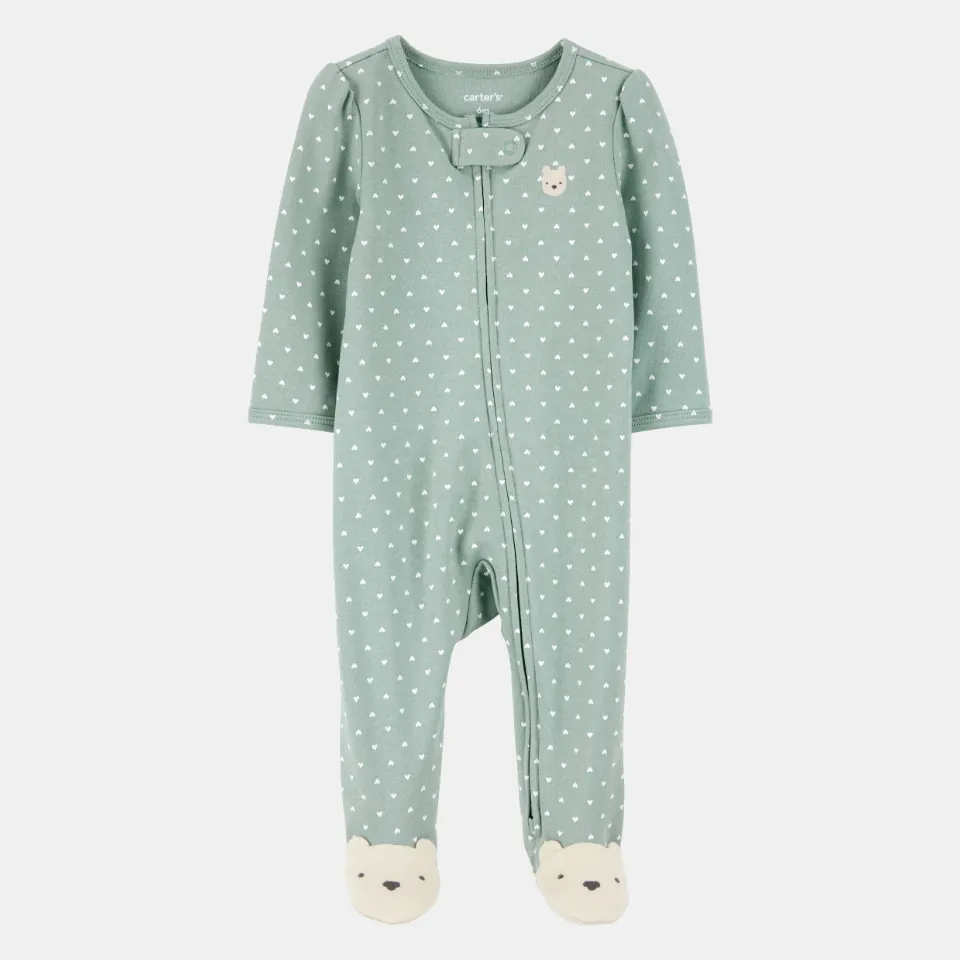 This one-piece takes the chaos out of diaper duty with a 2-way zip that opens from the top or bottom - because that 3 a.m. change waits for no one. Covered in soft green with a sweet polka dot print and finished with sleepy bear foot art, it's cozy enough for naps, nighttime, and everything in between.