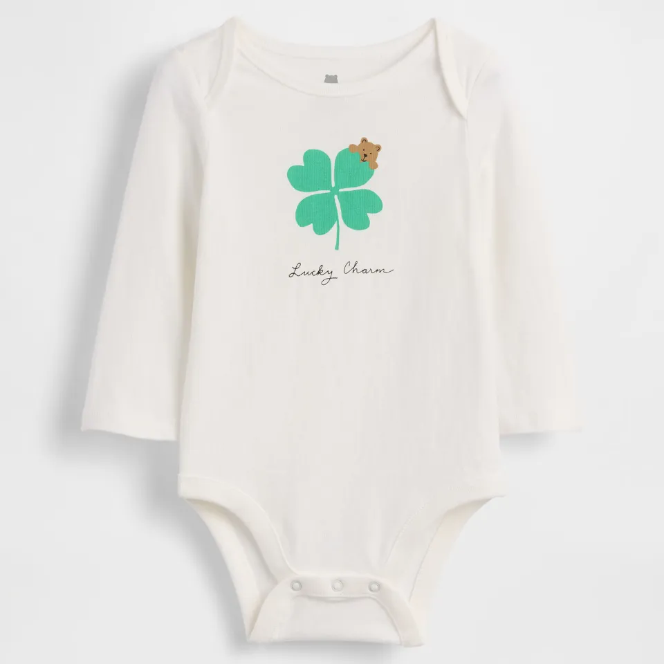 This adorable baby bodysuit is made from supersoft, 100% organically grown cotton, ensuring comfort for your little one. It features a crewneck with lapped shoulders for easy dressing, long sleeves adorned with bear and shamrock graphics, and convenient snaps at the inseam for effortless diaper changes.