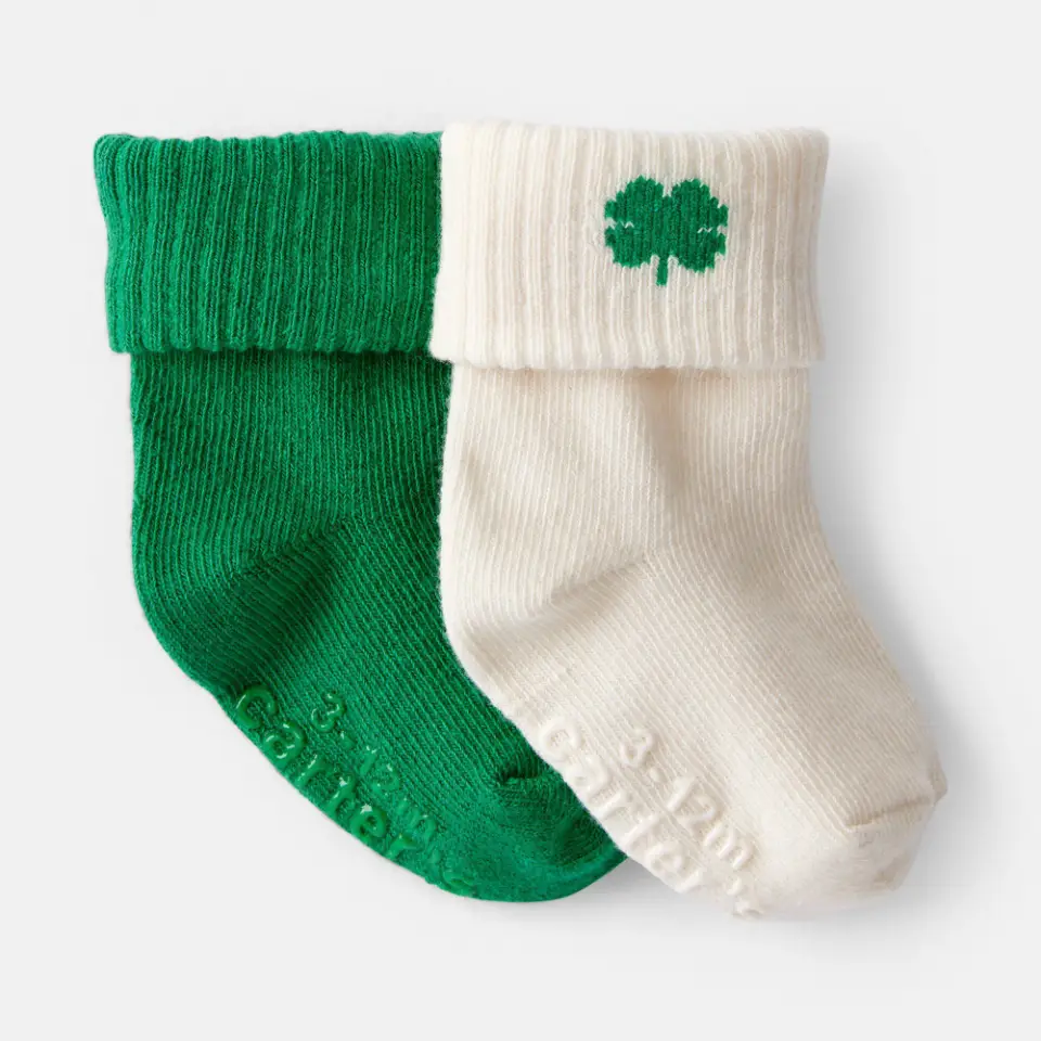 Two socks, twice the charm. This festive pair mixes classic crew style with a playful roll cuff-one in solid green, the other with a lucky clover pop.